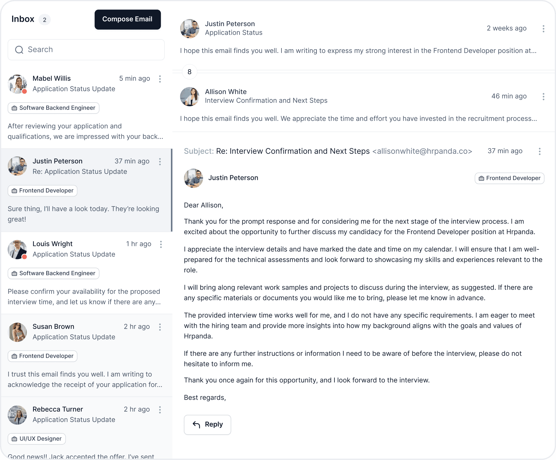 Utilize templates to accept or reject candidates and send emails directly. Candidates don't need to register in the system; let them respond via email and see their replies instantly, allowing for immediate interaction.
